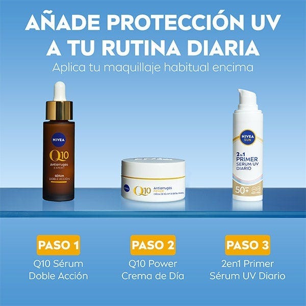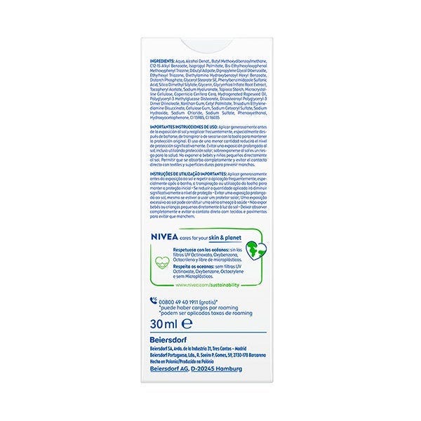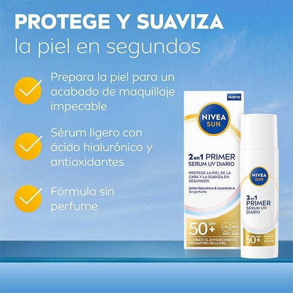 NIVEA SUN Protección facial 2en1 Primer Serum UV Diario SPF 50+ ha sido especialmente desarrollado para proteger y suavizar la piel del rostro en segundos. Alta protección inmediata contra los daños de los rayos UV a corto y largo plazo, como el envejecimiento prematuro de la piel. Este innovador serum ligero está enriquecido con dos tipos de Ácido Hialurónico y con Licocalcón A, un poderoso antioxidante que protege las células de la piel del estrés oxidativo. Mientras que el Ácido Hialurónico de cadena larga hidrata las capas superiores de la piel, el de cadena corta penetra más profundamente y estimula la producción natural de Ácido Hialurónico (in vitro). Es un serum muy ligero, no graso, no pegajoso y que no deja residuos blancos en la piel. Se absorbe inmediatamente y es ideal para uso diario y como base de maquillaje. Adecuado para layering. Acabado invisible en todos los tonos de piel
