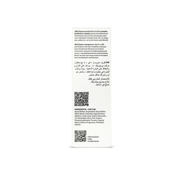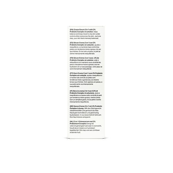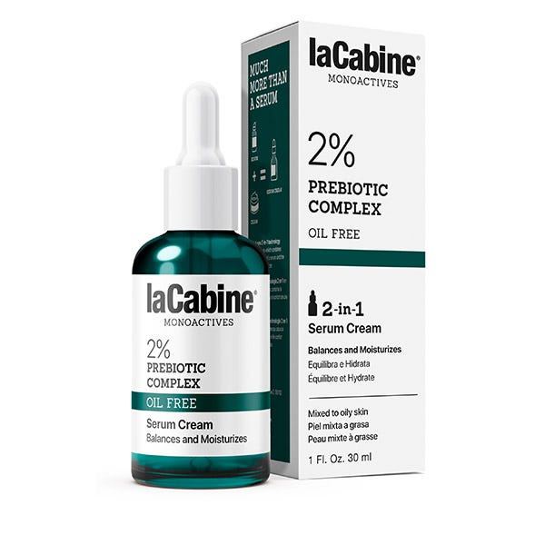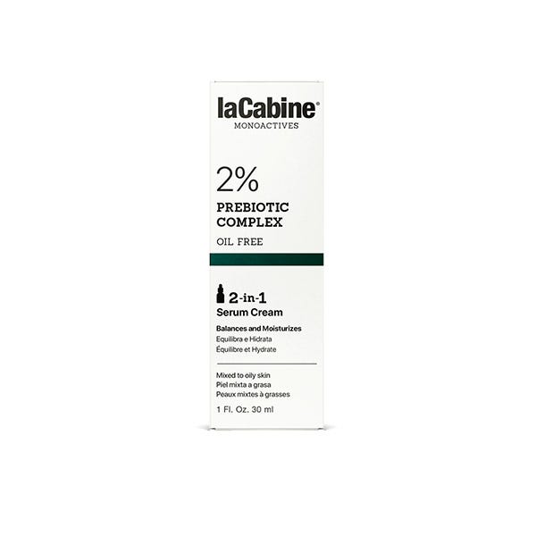 Sérum Crema 2 en 1 laCabinecon 2% Prebiotic Complex en solución, ayuda a reequilibrar y a mantener bajo control las pieles con tendencia mixta a grasa, a la vez que hidrata.