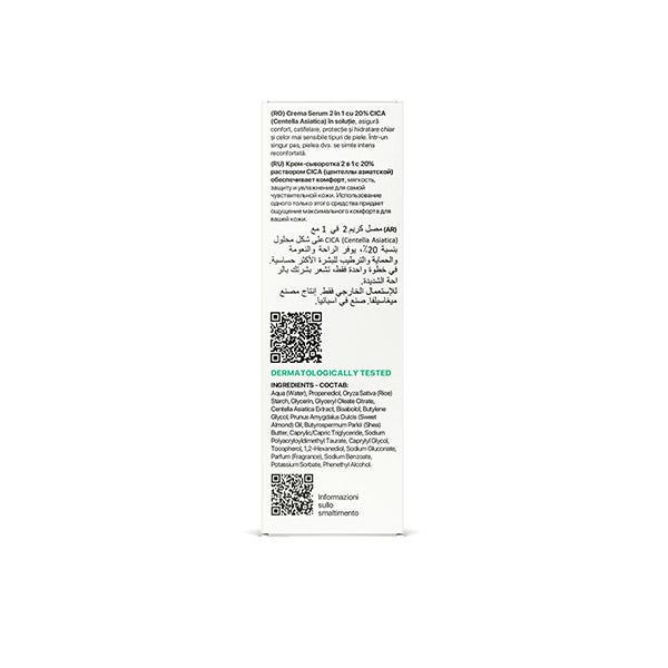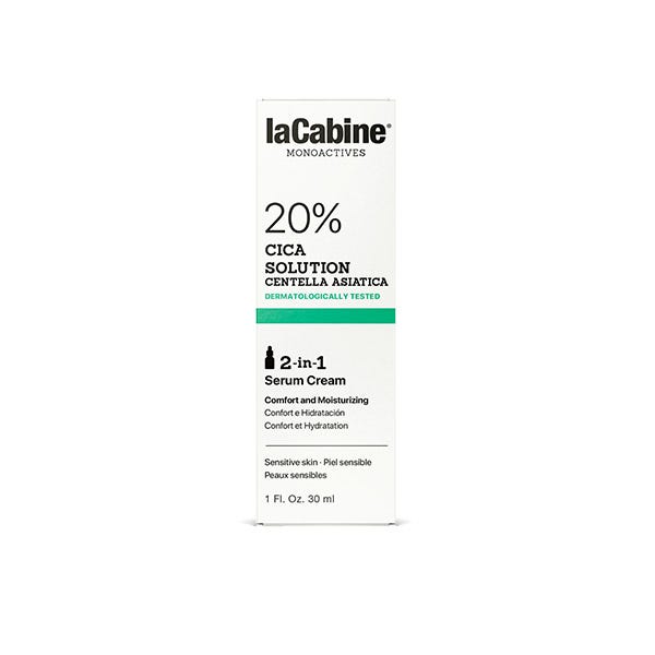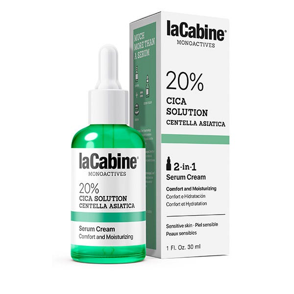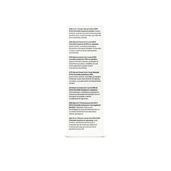 Sérum Crema 2 en 1 con cica (Centella Asiatica) al 20% en solución, ayuda a calmar las rojeces y a proteger las pieles más sensibles, al mismo tiempo que hidrata y aporta confort a tu rostro.