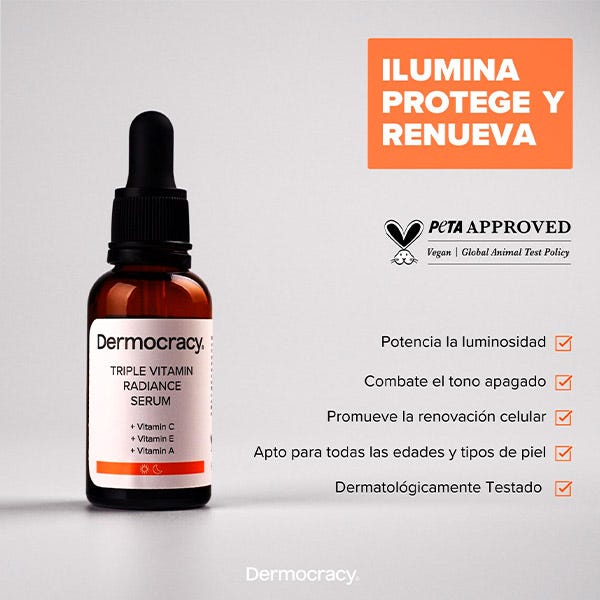 Ilumina y revitaliza tu piel con el TRIPLE VITAMIN RADIANCE SERUM. Esta fórmula avanzada combina tres poderosas vitaminas: C, E y A, diseñadas para trabajar en sinergia y potenciar la luminosidad, protección y renovación de tu piel. Descubre un rostro más radiante, protegido contra los radicales libres y con una apariencia rejuvenecida.