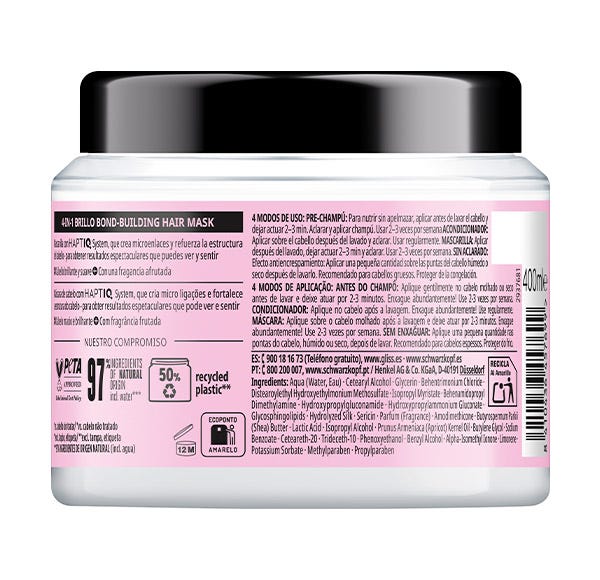 Desarrollada para cabellos dañados y apagados. Con Seda que hace que el cabello sea extraordinariamente suave y fácil de desenredar. La Mascarilla Liquid Silk 4 en 1 Brillo contiene una fórmula con HaptIQ System que crea micro enlaces y refuerza la estructura capilar, nutre y repara profundamente el cabello, proporcionando brillo al cabello sin apelmazar.