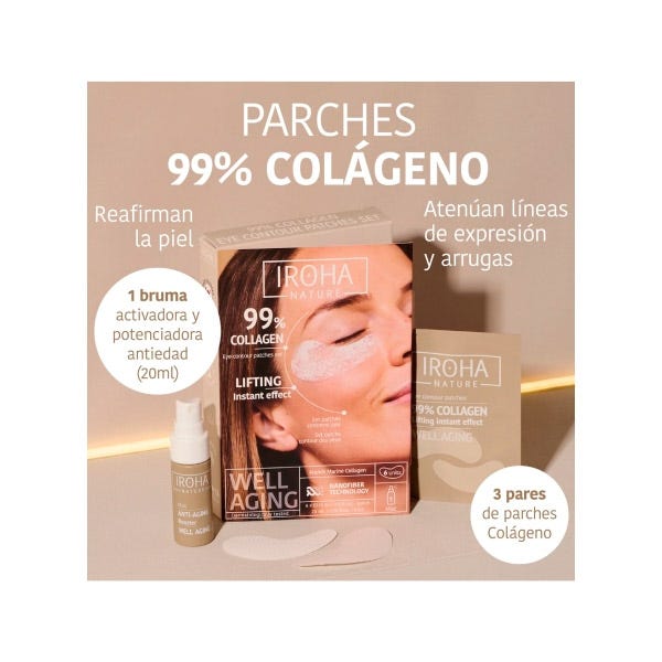 El Parches para el contorno de ojos 99% Collagen Lifting Effect de Iroha Nature combina la innovadora tecnología Electrospinning con una bruma activadora que disuelve sus nanofibras al instante, liberando el colágeno directamente en las capas más profundas de la piel.