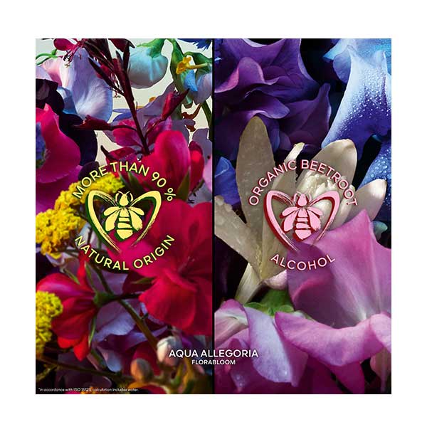 Florabloom Absolu adopta el frasco emblemático de la colección Allegoria, elaborado en Francia y realizado a partir de un 15% de vidrio reciclado. Su vaporizador desenroscable y su lacado transparente facilitan su reciclaje.