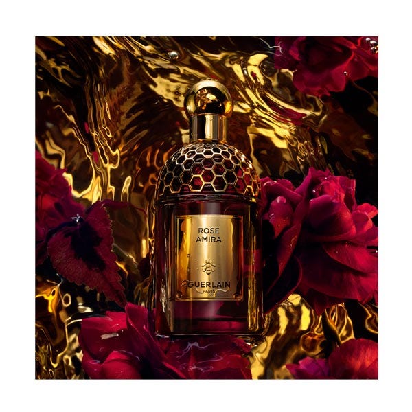 "Rose Amira es mi visón particular de la rosa, suntuosa y sensual en el secreto de la noche. Una rosa erguida, mirando hacia la luna, en una estela poética y nocturna". - Delphine Jelk, perfumista de Guerlain