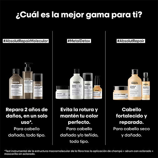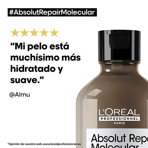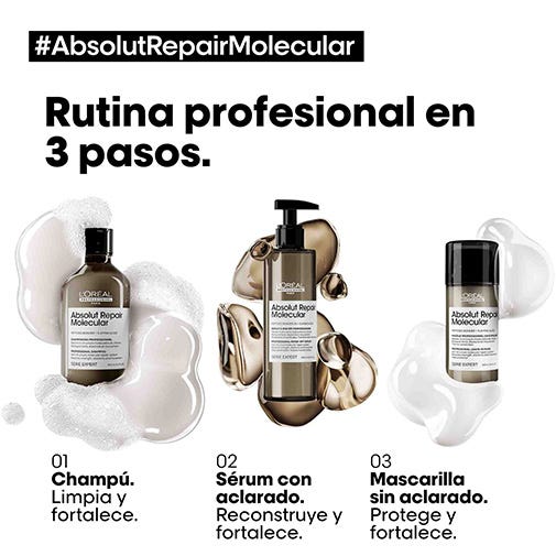 Para unos resultados óptimos, utilizar después del champú Absolut Repair Molecular y del Sérum con aclarado.