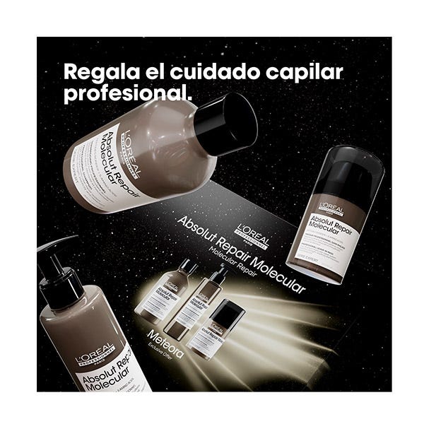 Absolut Repair Molecular de Serie Expert es una gama profesional de cuidado capilar para cabello muy dañado. Reconstruye la estructura macromolecular del cabello, reparando 2 años de daños y para 100 horas de brillo.