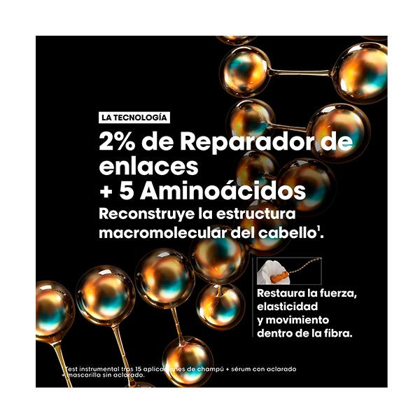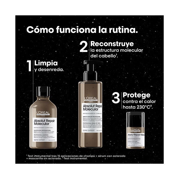 Sérum profesional Absolut Repair Molecular (250ml), para cabello dañado, diseñado con un 2% de enlaces Peptídicos + 5 Aminoácidos. Esta tecnología exclusiva repara la estructura molecular del cabello. La textura está inspirada en la textura de los sérums para el cuidado de la piel. Penetra profundamente en la fibra capilar para reconstruir la resistencia del cabello a nivel capilar.Restaura la elasticidad y el movimiento natural del cabello.El cabello está visiblemente transformado: el brillo y la suavidad del cabello se mejoran considerablemente.