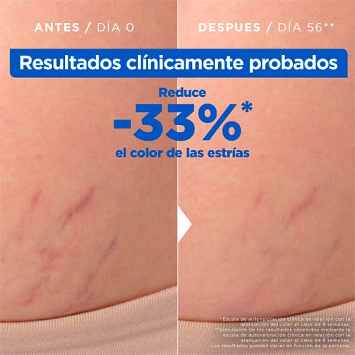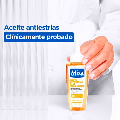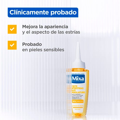 El nuevo Aceite Antiestrías Mixa, con un 30% de Omega 6 y 9, reduce un 33% el color de las estrías*. Su fórmula es adecuada para el postparto, con un acabado no graso. *Autoevaluación en 43 sujetos después de 8 semanas.
