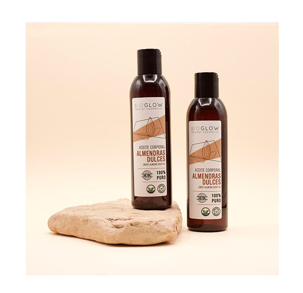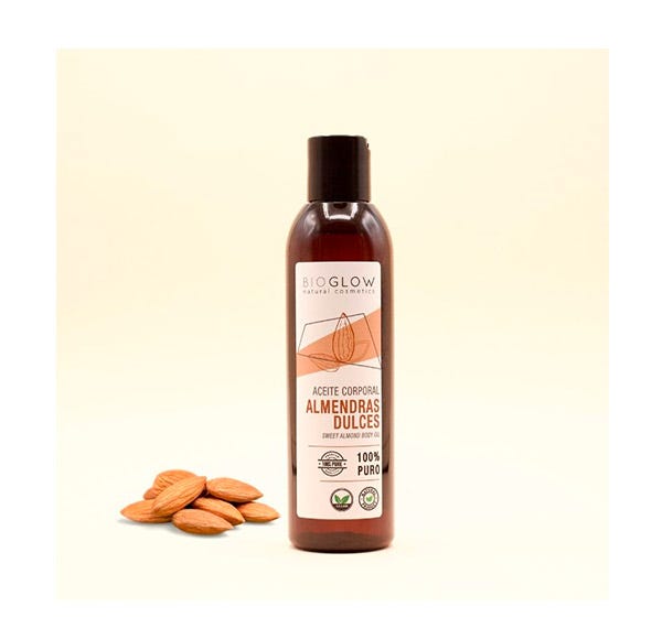 Bioglow Aceite Corporal Almendras Dulces hidrata intensamente y regenera la piel seca e irritada. Previene las estrías durante el embarazo y es perfecto para las pieles sensibles. Deja la piel suave y nutrida.