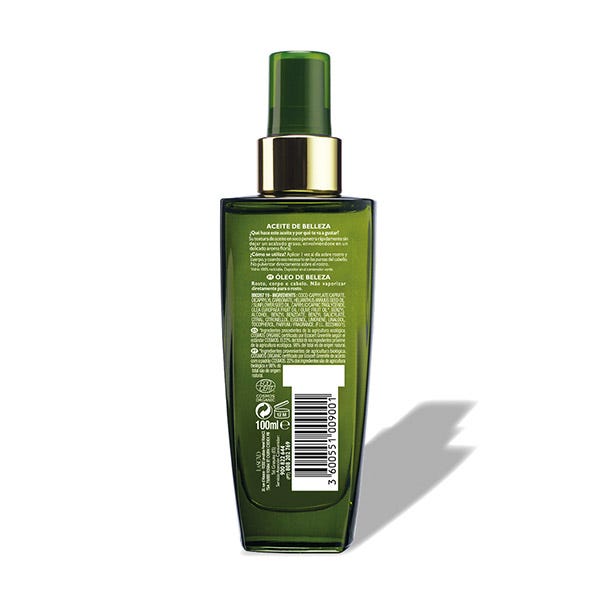 El Aceite de Belleza Multiusos para rostro, cuerpo y cabello con Aceite de Oliva Bio, nutre, suaviza y realza la belleza natural de tu piel. Su textura no grasa, envuelve en un delicado aroma floral.