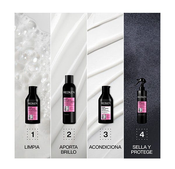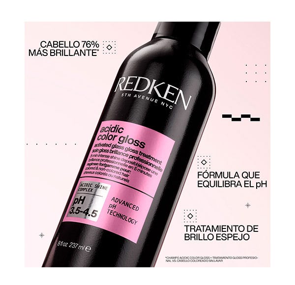 Tratamiento gloss profesional para cabello con brillo formulado con Acidic Shine Complex y Tecnología pH Avanzada que potencia el brillo del cabello gracias a su fórmula con pH ácido que sella la cutícula y fija el brillo para un color vibrante más duradero. Infundido con Ácido Cítrico y Aceite de Albaricoque, trabaja a nivel molecular para un brillo e hidratación incomparables.