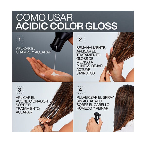 Para uso semanal después del champú. Utilizando guantes desechables adecuados, aplicar Acidic Color Glass Gloss Treatment sobre el cabello seco con una toalla.