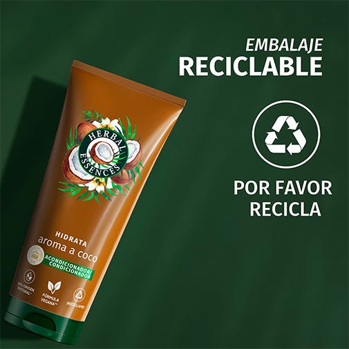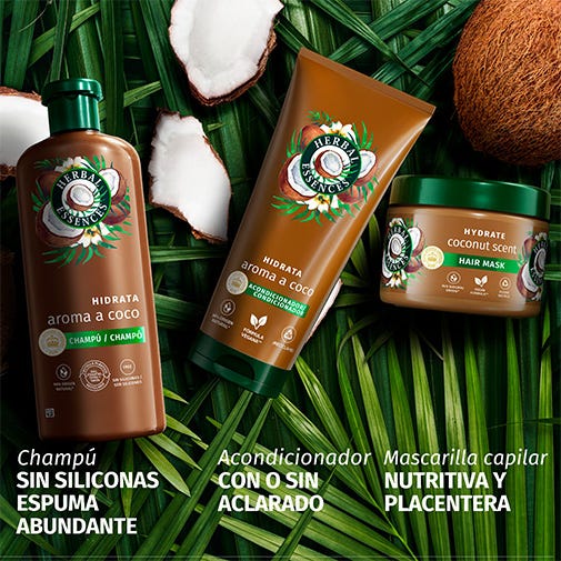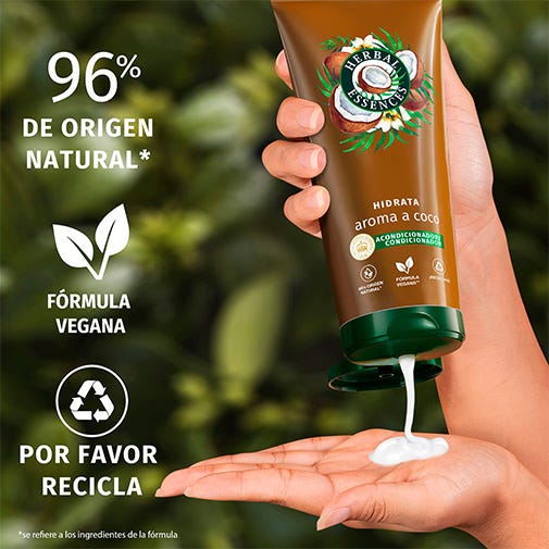 Herbal Essences Acondicionador Hidratante con Aroma a Coco ayuda a hidratar el pelo muy seco, aportando una sensación de equilibrio y transportando tus sentidos gracias a su suave aroma. Al mezclar nutrientes de origen vegetal infusionados con extracto de coco, obtenemos una fórmula vegana que hidrata el pelo seco. Nuestra lujosa y cremosa fórmula se puede usar como acondicionador con aclarado o sin aclarado, para disfrutar esta intensa sensación durante más tiempo
