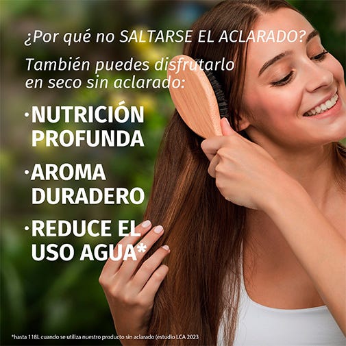 Nuestra fórmula puede ser utilizada sin aclarado. Solo ajusta la cantidad. Con aclarado: aplicar sobre el cabello mojado de medios a puntas y aclarar.