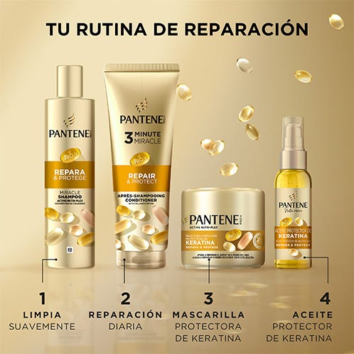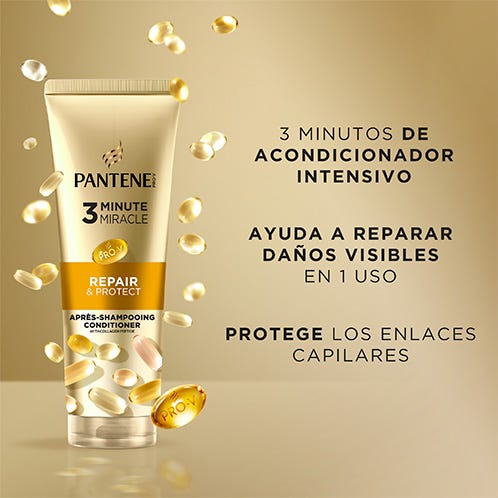 Descubre el acondicionador 3 Minute Miracle Pantene Repara y Protege con fórmula Pro-V y tecnología ACTIVE NUTRI-PLEX. Este tratamiento intensivo está especialmente formulado para proporcionar una nutrición y reparación*, lo que lo convertirá en una parte esencial de tu ritual de cuidado del pelo. Nuestra exclusiva mezcla de nutrientes, infusionada con Provitamina B5, lípidos fortificantes, antioxidantes protectores y péptido de colágeno, ofrece un tratamiento completo para la salud capilar