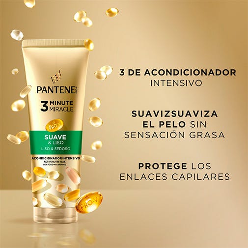 Descubre el acondicionador Pantene 3 Minute Miracle Suave y Liso con fórmula Pro-V y tecnología ACTIVE NUTRI-PLEX. Este tratamiento intensivo está especialmente formulado para proporcionar una nutrición y reparación* y se convertirá en una parte esencial de tu ritual de cuidado del pelo.