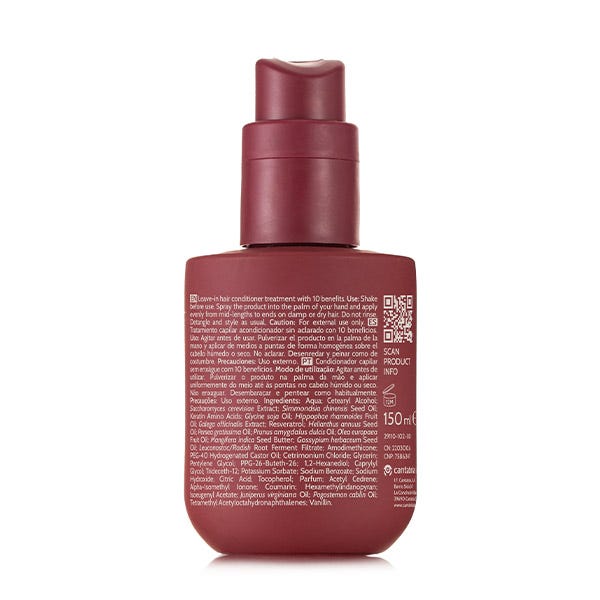 Acondicionador sin aclarado que aporta 10 beneficios: mejora la suavidad y elasticidad, reestructura el cabello seco y dañado, refuerza y aumenta la resistencia a la rotura, acondiciona y desenreda, mejora la manejabilidad, reduce el frizz, protege frente el daño térmico, mejora le brillo, protege el color de la fibra, y refresca el peinado.
