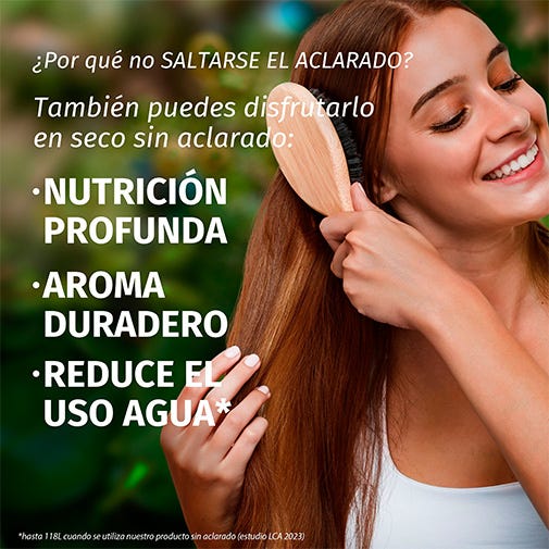 Nuestra fórmula puede ser utilizada sin aclarado. Solo ajusta la cantidad. Con aclarado: aplicar sobre el cabello mojado de medios a puntas y acla