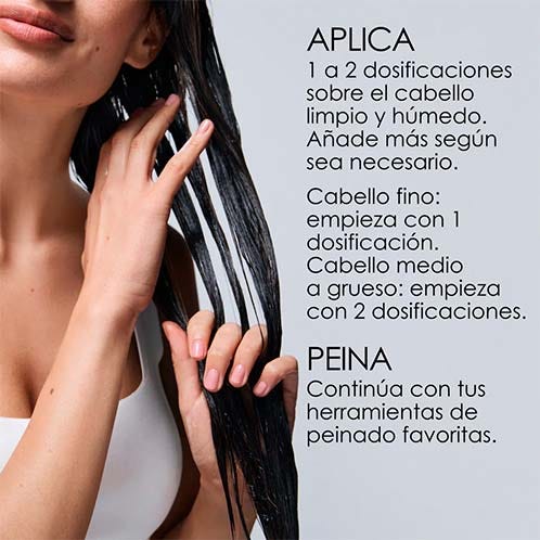1. Aplica 1-2 dosis sobre el cabello limpio y húmedo. Puedes añadir más si es necesario.*