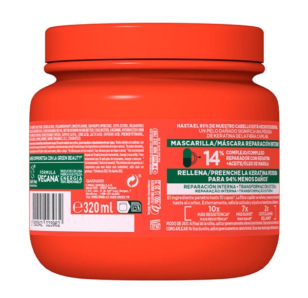 Transforma tu rutina capilar con la Mascarilla Adiós Daños de Garnier Fructis, enriquecida con el poderoso Aceite de Marula para revitalizar tu cabello dañado. Esta fórmula vegana, con un 13% de complejo reparador con keratina, te brinda una experiencia de cuidado intensivo que se refleja en resultados visibles.