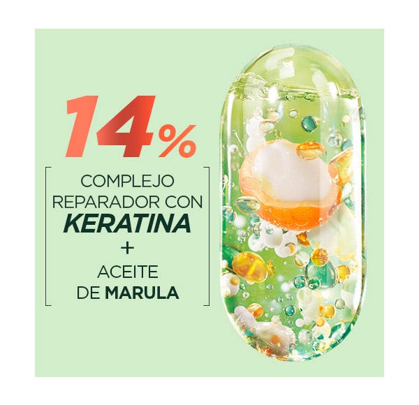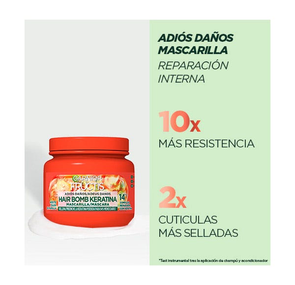El Aceite de Marula, conocido por sus propiedades nutritivas, se fusiona con la keratina para crear una combinación potente que no solo repara profundamente tu cabello, sino que también le proporciona 10 veces más resistencia*. Con la Mascarilla Adiós Daños de Fructis, dile adiós a los daños y experimenta la magia de un cabello reparado y fortalecido. *Test instrumental