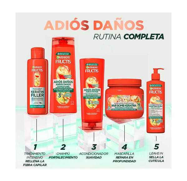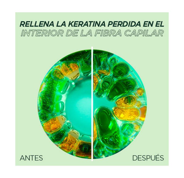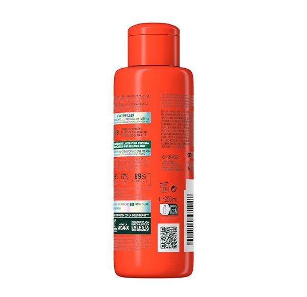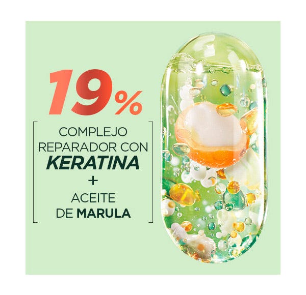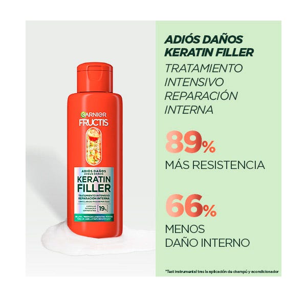Descubre el secreto de la reparación capilar con el Tratamiento intensivo Keratin Filler de Fructis Adiós Daños de Garnier, enriquecido con el poderoso Aceite de Marula. Diseñado especialmente para cabellos dañados, este tratamiento ofrece una experiencia transformadora que rellena la keratina perdida, reduciendo hasta un 66% el daño interno de la fibra capilar.* Experimenta una reparación profunda con nuestro tratamiento enriquecido con un 19% de complejo reparador de keratina. Penetrando hasta 10 capas en la fibra capilar, restaura internamente hasta el cortex del cabello.