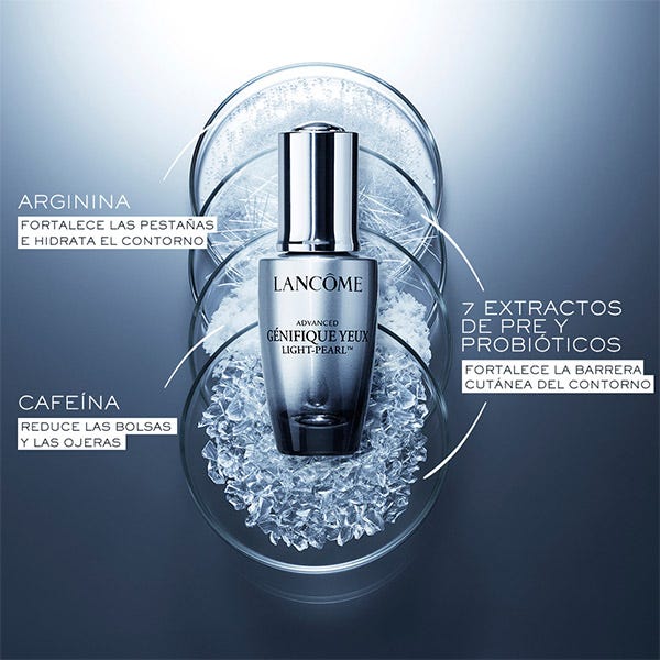 Nuestro serum contorno de ojos y pestañas experto Advanced Génifique Yeux Light-Pearl combina por primera vez 7 Extractos de Pre y Probióticos para una mirada más saludable y fortalecida, Cafeína para una piel revitalizada con ojeras y bolsas reducidas; y Arginina para unas pestañas fortalecidas y un contorno de ojos hidratado.