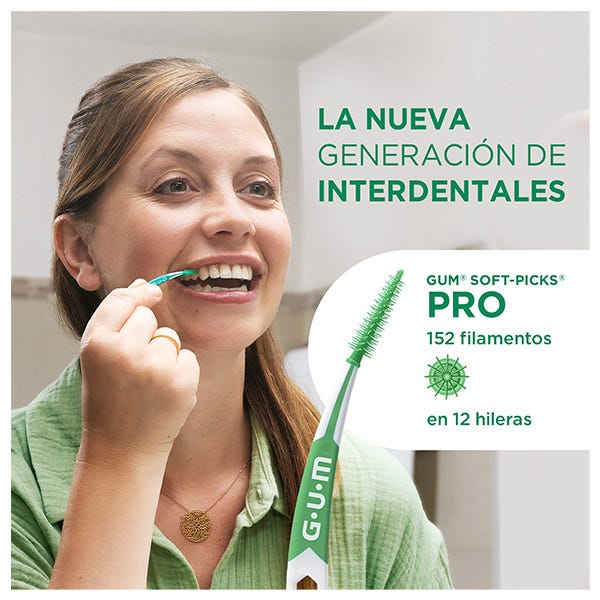 Los interdentales de goma GUM® SOFT-PICKS PRO® son la última innovación en higiene interdental. Su cabezal ha sido rediseñado para aportar un 50% más de eficacia eliminando la placa y los restos de alimentos allí donde el cepillo no llega. Cuentan con un cabezal inspirado en un cepillo interdental, manteniendo la comodidad y facilidad de uso de la línea SOFT-PICKS. Así, cuentan con el doble de hileras y casi el doble de filamentos que sus predecesores los GUM SOFT-PICKS ADVANCED, y limpian de forma ultrasuave y muy eficaz entre los dientes, donde el cepillo de dientes no puede llegar.