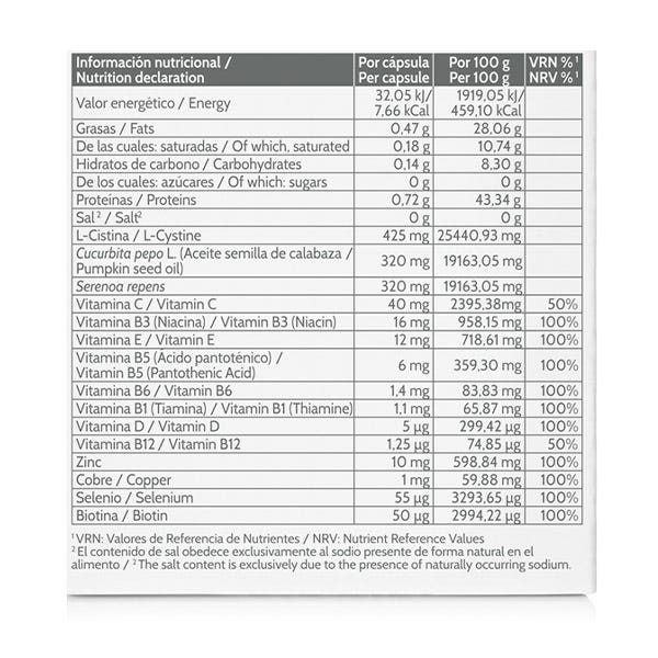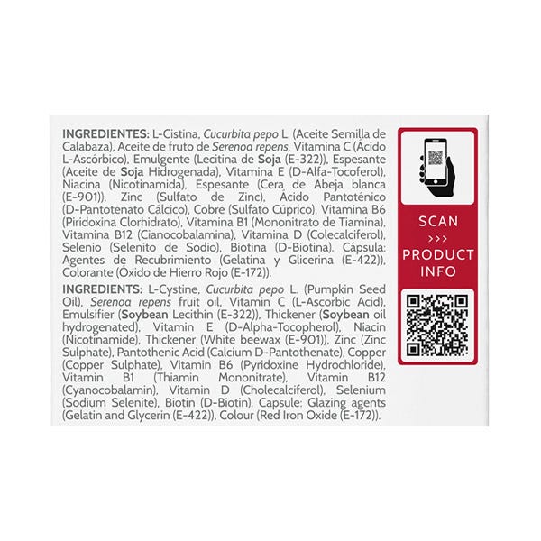 L-Cistina, Cucurbita pepo L. (Aceite Semilla de Calabaza), Aceite de fruto de Serenoa repens, Vitamina C (Ácido L-Ascórbico), Emulgente (Lecitina de Soja), Espesante (Aceite de Soja Hidrogenada), Vitamina E (D-Alfa Tocoferol), Niacina (Nicotinamida), Espesante (Cera de abeja), Zinc (Sulfato de Zinc), Ácido Pantoténico (D-Pantotenato Cálcico), Cobre (Sulfato Cúprico), Vitamina B6 ( Clorhidrato de Piridoxina), Vitamina B12 (Cianocobalamina), Vitamina B1 (Mononitrato de Tiamina), Vitamina D (Colecalciferol), Selenio (Selenito de Sodio), Biotina (D-biotina). Cápsula: Agente de recubrimiento; Gelatina, Glicerina; Colorante: Dióxido de silicio (E-551), Óxido de Hierro Rojo (E-172), Silicato de potasio y aluminio (E- 555), Dióxido de titanio (E-171).