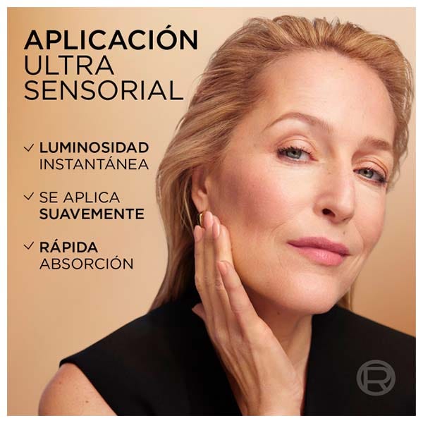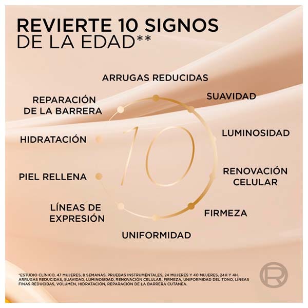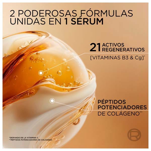 Enriquecido con péptidos de colágeno y vitaminas B3 y C*, ayuda a suavizar la piel, mejorar la luminosidad y reforzar el volumen facial, ofreciendo un aspecto visiblemente más joven. Su aplicador exclusivo permite dispensar ambas fórmulas de manera uniforme en un solo gesto, facilitando una aplicación rápida y precisa.