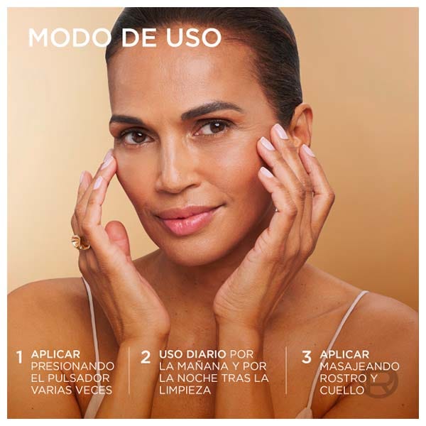 Para uso diario: presiona el centro del aplicador para distribuir homogéneamente las dos fórmulas. Aplica sobre rostro y cuello antes de tu tratamiento diario, masajeando suavemente hasta su completa absorción.