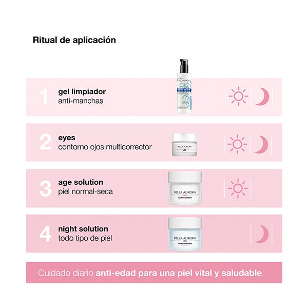 Aplicar una pequeña cantidad sobre rostro, cuello y escote con la piel limpia o después del serum, realizando un suave masaje hasta su completa absorción.