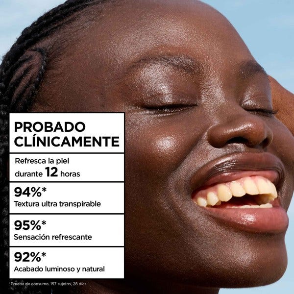 La nueva e innovadora tecnología UV cuenta con una textura acuosa para ofrecer una sensación ultraligera y está potenciada con ácido hialurónico para hidratar y refrescar la piel.