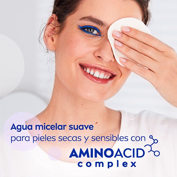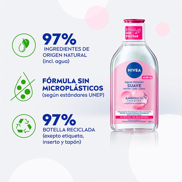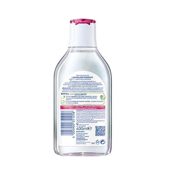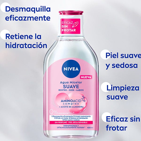 NIVEA Agua Micelar Suave Piel Seca / Sensible, especialmente formulada para piel seca o sensible, elimina el maquillaje, limpia y retiene la hidratación para una piel suave y sedosa, libre de residuos. Su fórmula con Amino Acid Complex y Aceite de Almendra está enriquecida con Micelas limpiadoras y Aminoácidos. Elimina eficazmente el maquillaje, las impurezas y la suciedad en unas pocas pasadas y sin necesidad de frotar. Contiene un 97% de ingredientes de origen natural (inc. agua) y la fórmula es libre de microplásticos (según la definición del PNUMA). En NIVEA nos importa el planeta tanto como tu piel, por eso hemos utilizado una botella de 97% material reciclado (excepto etiqueta, el inserto y el tapón) y creado fórmulas biodegradables como la de nuestro Agua Micelar Suave.