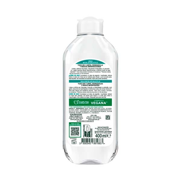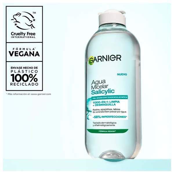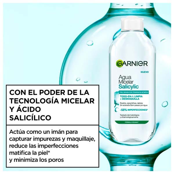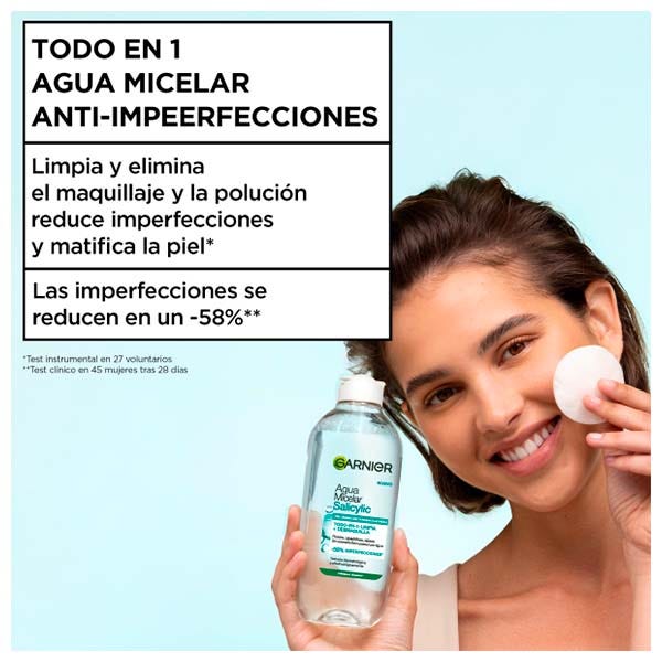 La solución limpiadora TODO EN 1 anti-imperfecciones: enriquecida con ácido salicílico, limpia y elimina cualquier tipo de maquillaje en rostro, ojos y labios mientras matifica la piel*, sin dejar residuos**.