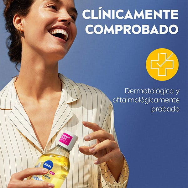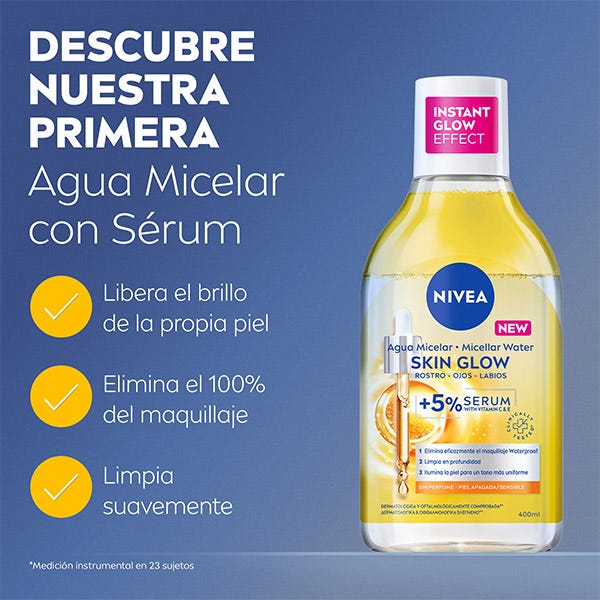 NIVEA Agua Micelar Skin Glow para pieles apagadas y sensibles, elimina eficazmente el maquillaje waterproof, limpia en profundidad e ilumina la piel para un tono más uniforme, sin dejar residuos grasos. Su fórmula con un 5% de Sérum con Vitamina C y E y Amino Acid Complex, energiza e hidrata la piel. Elimina el maquillaje, las impurezas y la suciedad en unas pocas pasadas y sin necesidad de frotar. Su fórmula iluminadora es compatible con la piel y los ojos y está dermatológica y oftalmológicamente comprobada.