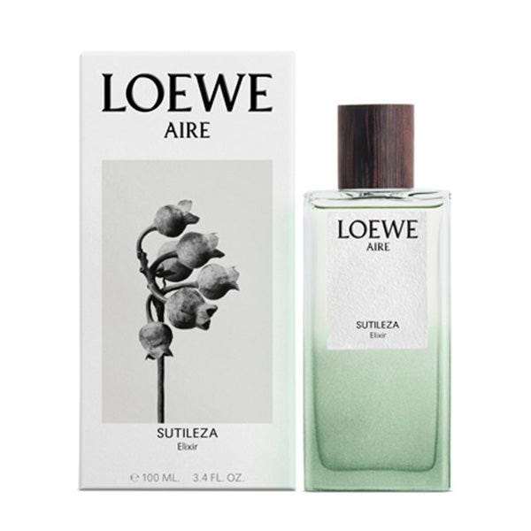 LOEWE Aire Sutileza Elixir EDP pertenece a la familia olfativa floral frutal y aparece encapsulado en un frasco de vidrio translúcido con un degradado en tono verde, haciéndose eco del frasco de la fragancia original, culminado por un tapón de madera wengué.