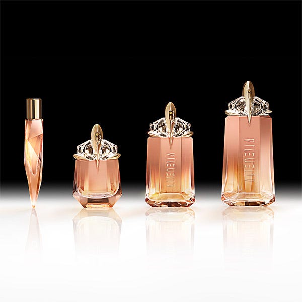 Para reflejar la radiante luz de Alien Goddess Supra Florale, el frasco está lacado en oro rosa, destacando el resplandeciente color de la supraflor de otro mundo. Una pieza de diseño vanguardista y arquitectónica tan atrevida como la ultra-deseable moda de Mugler.