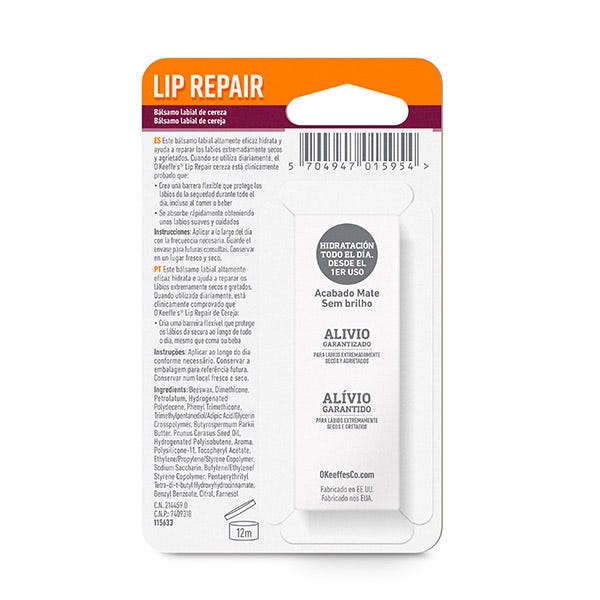 La fórmula altamente efectiva de O'Keeffe's Lip Repair alivia, hidrata y ayuda a reparar los labios extremadamente secos y agrietados para dejarlos suaves, tersos y saludables durante todo el día.