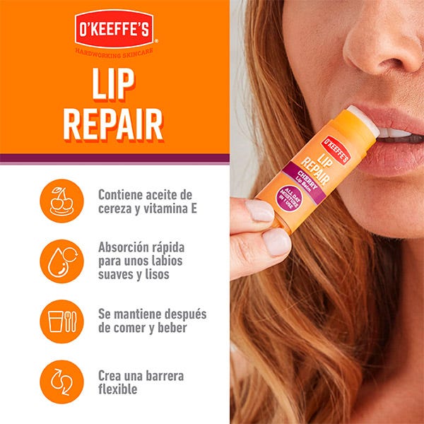 Con 7 hidratantes y acondicionadores, Lip Repair de O'Keeffe’s continúa actuando incluso mientras comes y bebes.