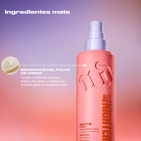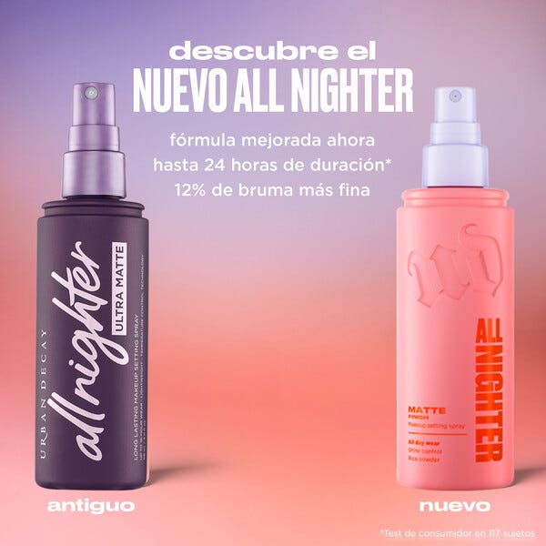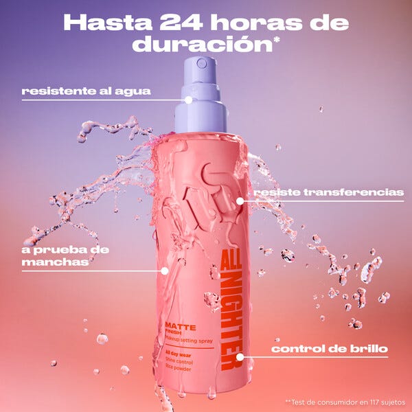 El spray fijador de maquillaje All Nighter Matte de Urban Decay ofrece un acabado mate, ligero y de larga duración que fija el maquillaje en su lugar hasta por 24 horas. *Test de consumidor en 107 sujetos Sus avanzados formadores de película de poder crean una barrera transpirable, protegiendo el maquillaje del agua, el sudor, sin desvanecerse ni transferir, mientras controlan el exceso de brillo.