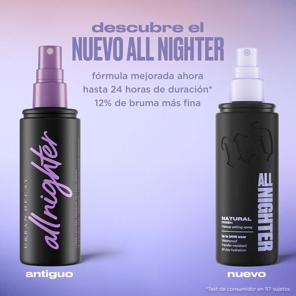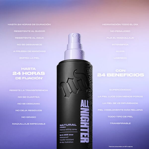 Urban Decay All Nighter Makeup Setting Spray es un spray fijador de culto que fija tu look hasta 24 horas* *Test de consumidor en 102 sujetos . Diseñado con potentes formadores de película, esta fórmula es waterproof y no transfiere mantiene el maquillaje intacto, vibrante y sin grietas de la mañana a la noche.