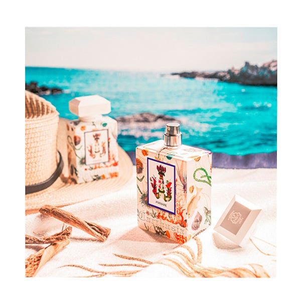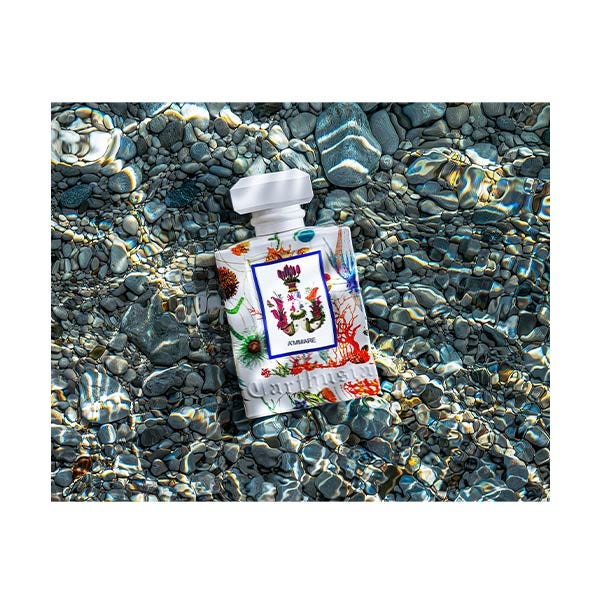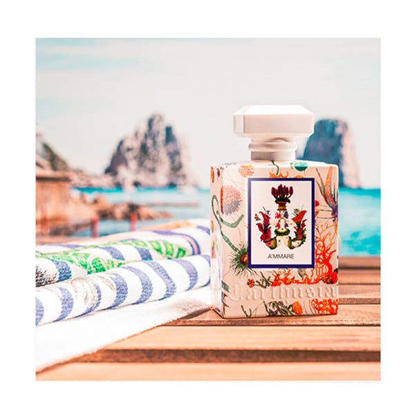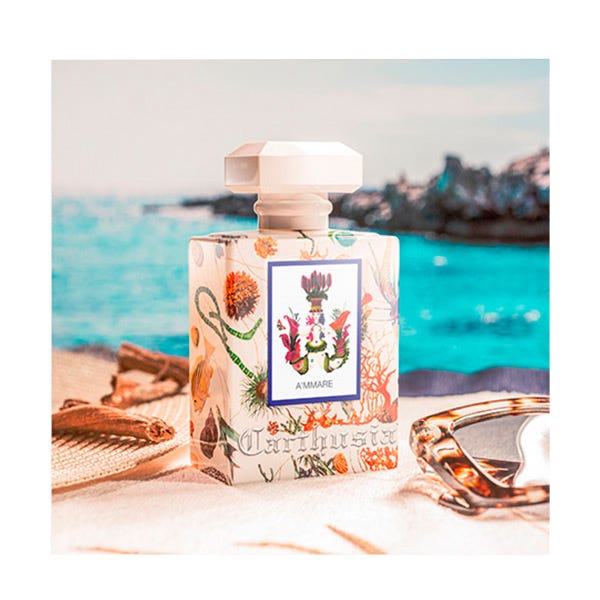 La fragancia A’MMARE de Carthusia representa la vida y la armonía. Está inspirada en un jardín secreto que se abre entre las calles de la isla de Capri y se cruza bajo el velo de las olas, traen ramas de coral y vegetales a la orilla con conchas y explosiones naturales realzadas por un día soleado.