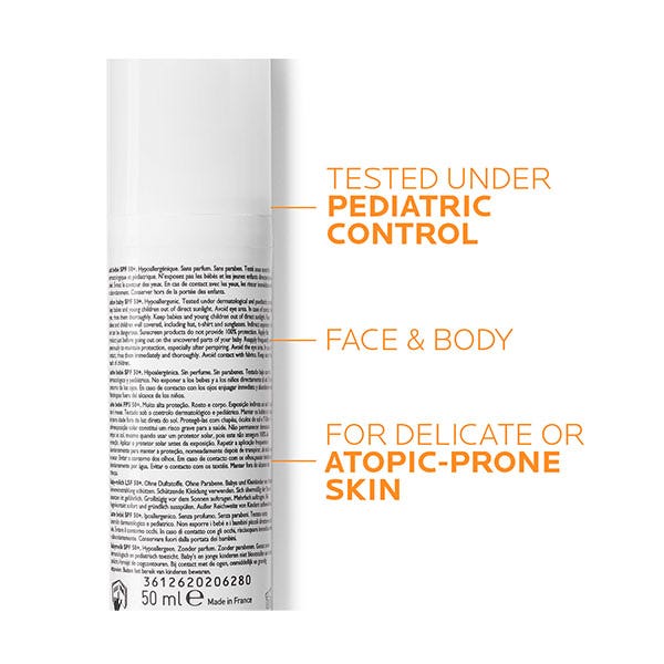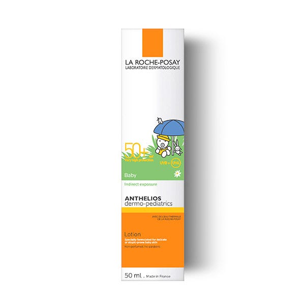 Anthelios Dermo-Pediatrics Leche Bebé spf50+ es un protector solar de rostro y cuerpo para la piel frágil, delicada y clara de los bebés de muy alta protección de amplio espectro UVA/UVB, para la exposición indirecta al sol. Ayuda a prevenir el estrés oxidativo derivado de la exposición a los rayos infrarrojos y a la polución. Contiene una protección óptima y equilibrada reforzada contra los rayos UVA (más estricta que las recomendaciones europeas sobre productos de protección solar) gracias al sistema filtrante patentado con [XL-PROTECT]TM combinado con Agua Termal de La Roche-Posay, calmante y antioxidante.
