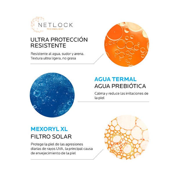 Leche hidratante que proporciona una protección UVA/UVB muy alta y de amplio espectro con Netlock Technology que envuelve la emulsión y los filtros UV en estructuras micro-cristalizadas que hacen la fórmula no grasa y muy resistente. Todo ello, con una fórmula respetuosa con la vida marina y en un envase de cartón que permite la reducción de un -45% de plástico*