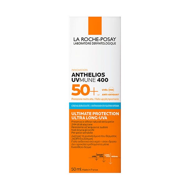 Anthelios UVMUNE 400 Crema Hidratante spf50+ es un protector solar de rostro de muy alta protección de amplio espectro, incluso contra los rayos UV más insidiosos*(ULTRA-LONG UVA**,UVA/UVB/IR-A/polución) ideal para todo tipo de piel, especialmente la piel sensible y reactiva, para uso diario, acabado invisible.