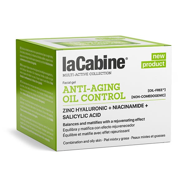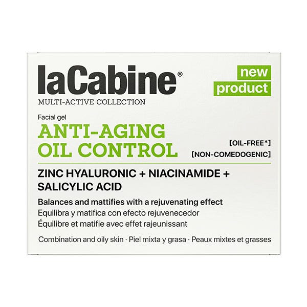 La Cabine Anti-Aging Oil Control gel facial antiedad para pieles mixtas a grasas de textura ligera con alga Kombu, Ácido Salicílico, Niacidamida y Zinc.