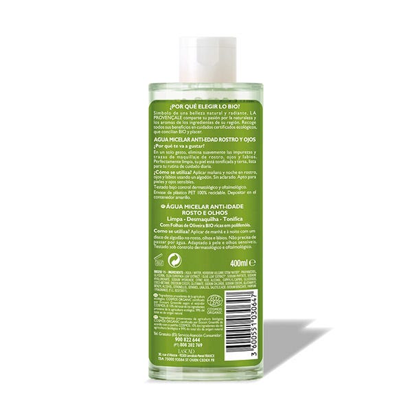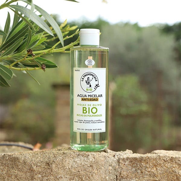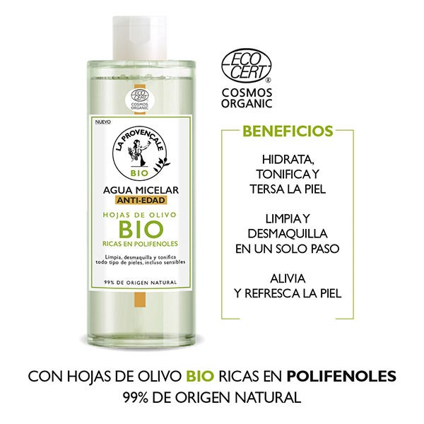 Enriquecida con extracto de hojas de olivo BIO, rico en polifenoles, el Agua micelar antiedad de la Provençale Bio limpia y tonifica la piel sin resecarla, eliminando suavemente impurezas y restos de maquillaje de rostro, ojos y labios.
