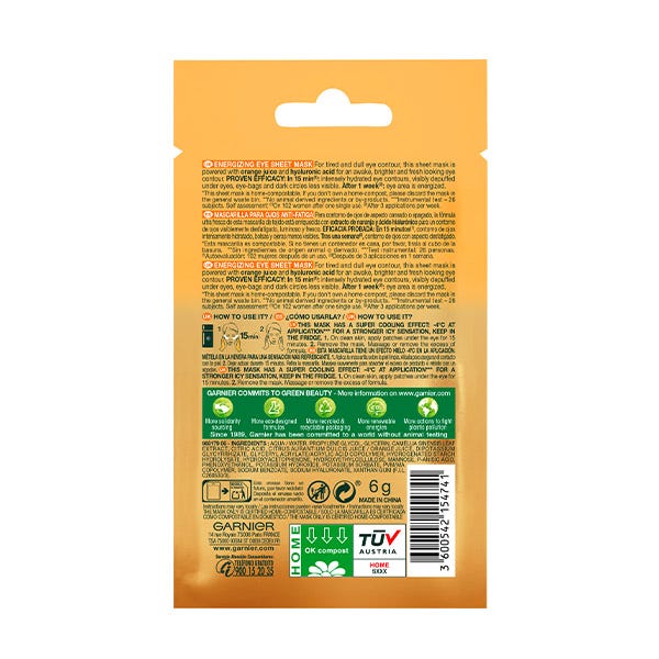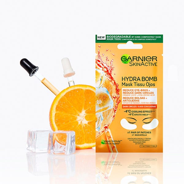 La Mascarilla de Tejido Anti-Fatiga contiene extracto de naranja y ácido hialurónico y está diseñadas para reducir bolsas y ojeras.