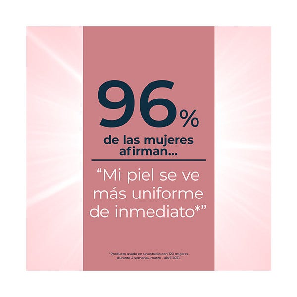 En un estudio de uso del producto con 80 mujeres, entre el 93 y el 96% de las participantes afirmaron que, tras cuatro semanas, esta crema antimanchas de cuidado facial unifica la piel de inmediato y la deja más uniforme y suave, protege eficazmente del sol y proporciona una cobertura ligera moderada.